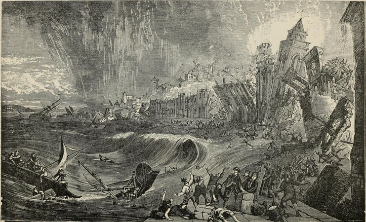A estes impulsos da terra se retirou o mar, deixando nas suas margens ver o fundo às suas águas nunca de antes visto, e encapelando-se estas em altíssimos montes, se arrojaram pouco depois sobre todas as povoações marítimas com tanto ímpeto, que parecia quererem submergi-las […]. Três irrupções maiores, além de outras menores, fez o mar contra a terra, destruindo muitos edifícios, e levando muitas pessoas envoltas nas suas águas.