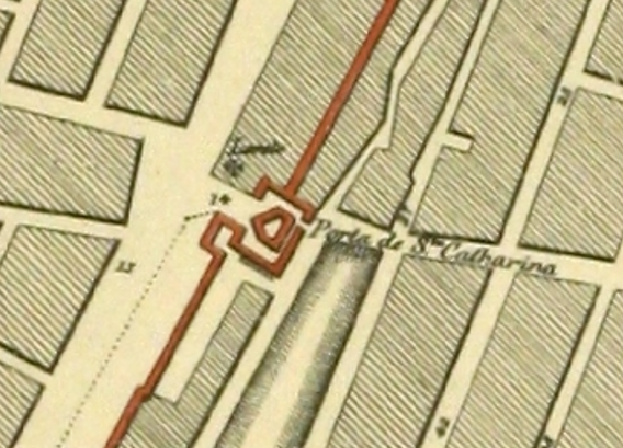 Designada por Porta de Santa Catarina por se situar nas imediações do local da primitiva ermida de Santa Catarina, era uma das mais movimentadas da cerca, não só por ser a única situada no sector compreendido entre a zona do Mosteiro da Trindade e o Cata-que-Farás, mas também por ser através dela que se acedia, por exemplo, a Campolide ou à região de Carnaxide. Talvez por isso tenha sido erguida com um cuidado muito particular de modo a torná-la mais resistente e, tanto quanto possível, impenetrável. Daí que estivesse reforçada, no exterior, por uma barbacã e por um fosso, que se estendiam para norte e para sul, paralelamente ao lanço ocidental da cerca.