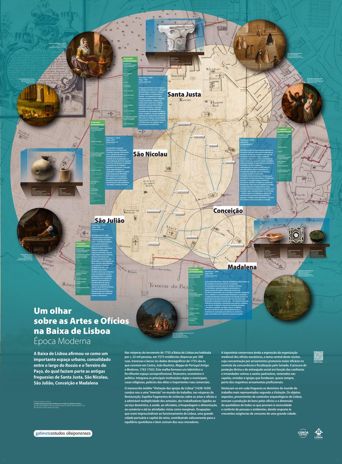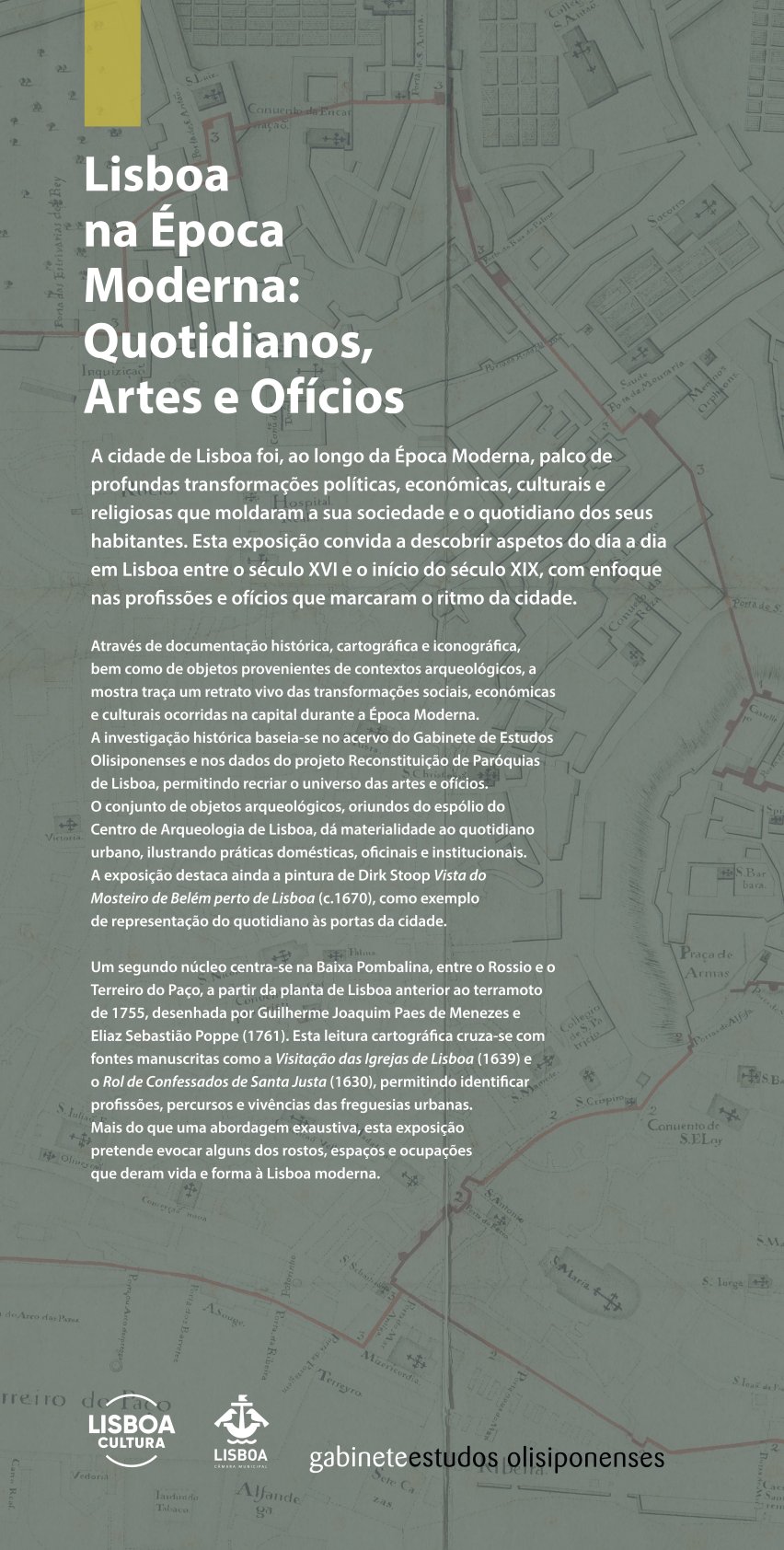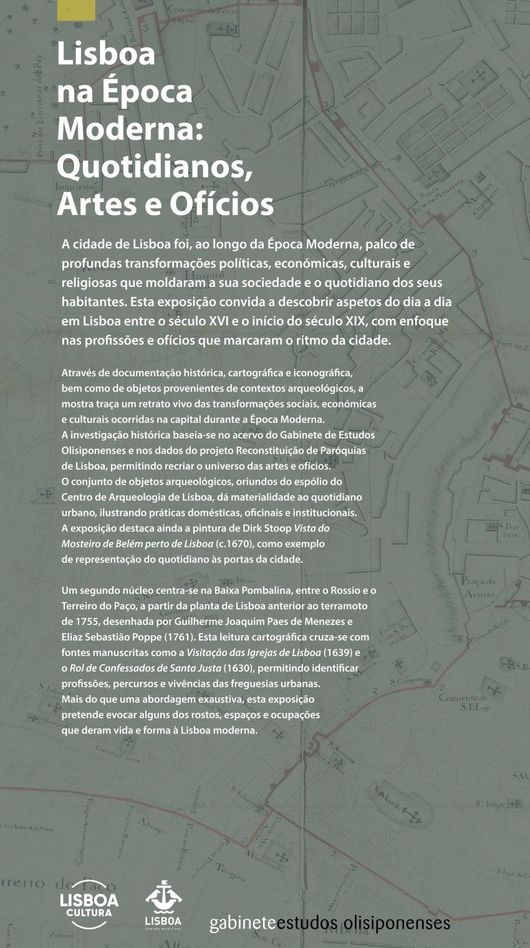 A exposição “Lisboa na Época Moderna: Quotidianos, Artes e Ofícios” integra-se num projeto de investigação dedicado à História da População de Lisboa, desenvolvido no núcleo de Demografia Histórica do Gabinete de Estudos Olisiponenses.