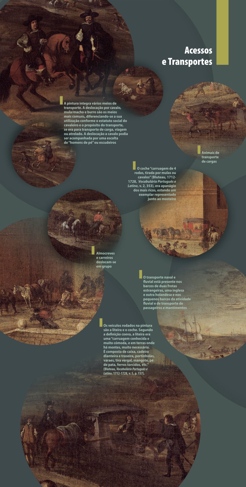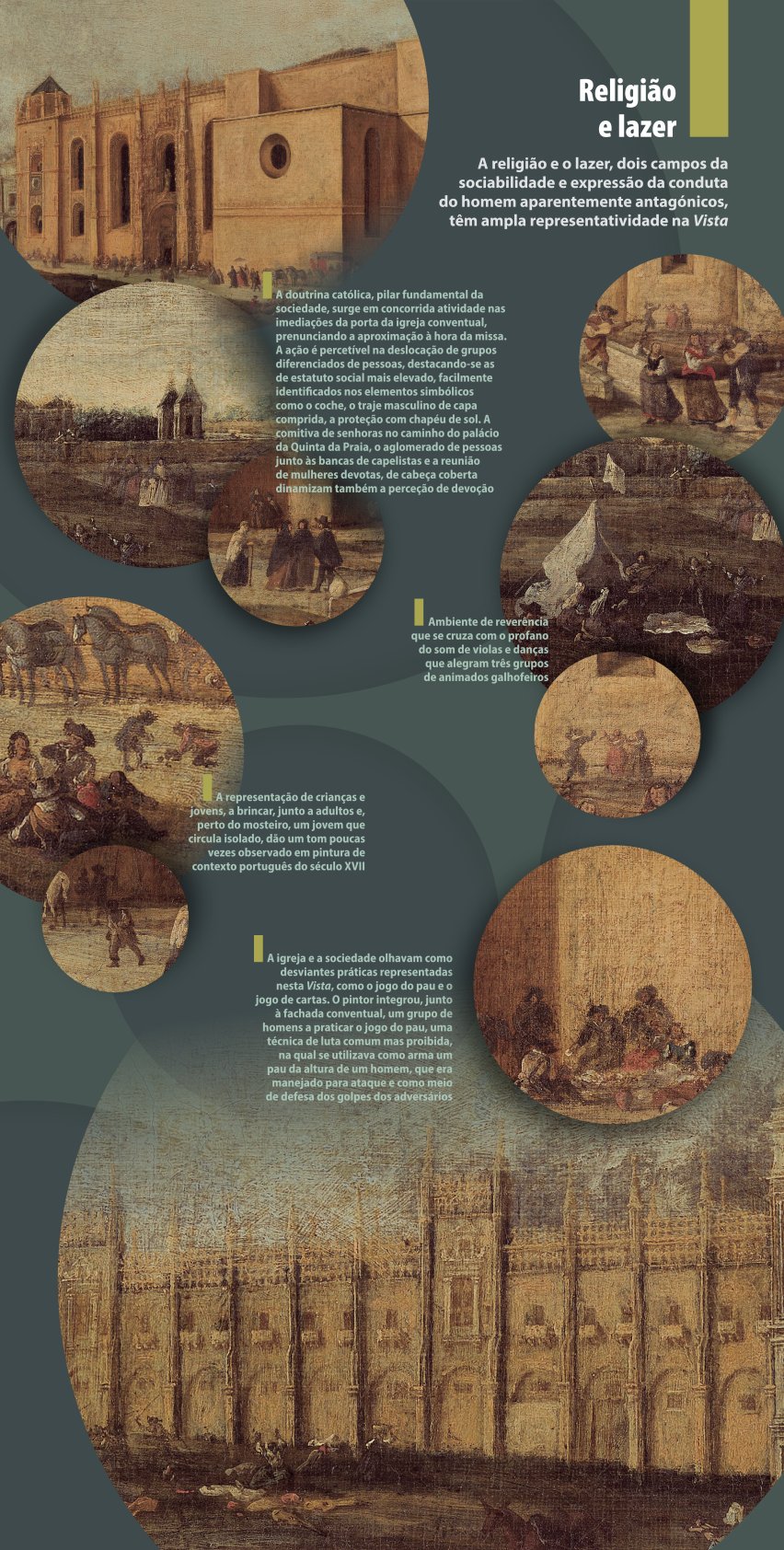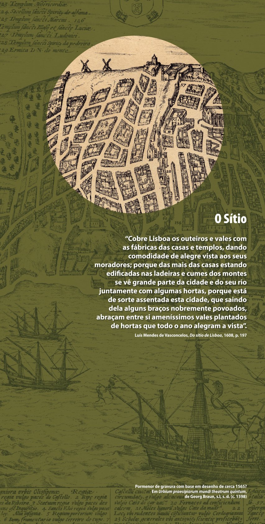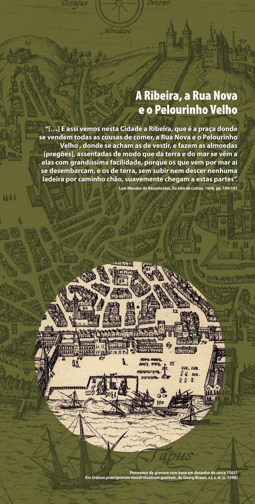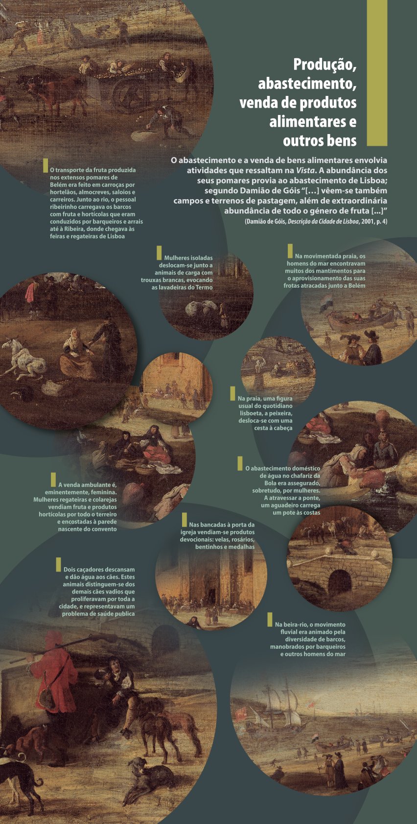 A iconografia quinhentista introduz o visitante na dimensão e configuração da cidade em transformação, destacando os principais núcleos urbanos e espaços emblemáticos. A representação de Belém, datada de meados do século XVII, embora longe do centro reforça a vivacidade do quotidiano lisboeta, captando um dia comum na dinâmica ribeirinha.