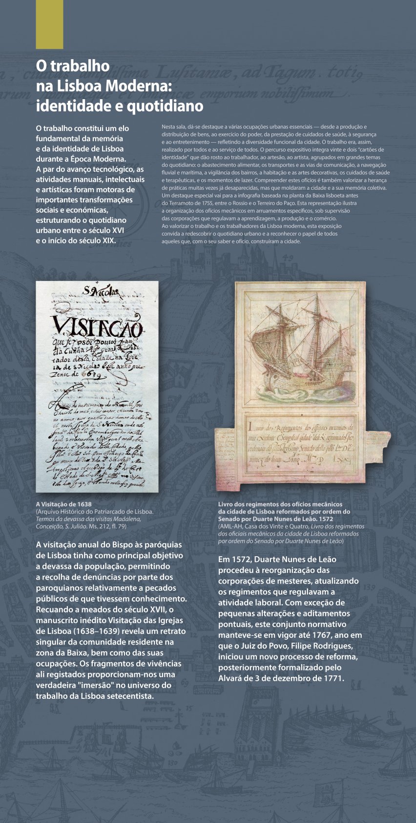 Partindo de um vasto conjunto de fontes manuscritas — com registos de pessoas reais que viveram na cidade — e de objetos provenientes de diversos contextos arqueológicos (Centro de Arqueologia de Lisboa), a mostra propõe uma viagem ao quotidiano lisboeta de há mais de quinhentos anos. Através das artes, ofícios e profissões que estruturavam a vida urbana, evidencia-se o papel essencial de numerosas atividades no funcionamento da cidade: do abastecimento alimentar aos transportes, da produção de bens aos cuidados de saúde, da construção à alimentação, do vestuário, ao lazer e à vigilância.